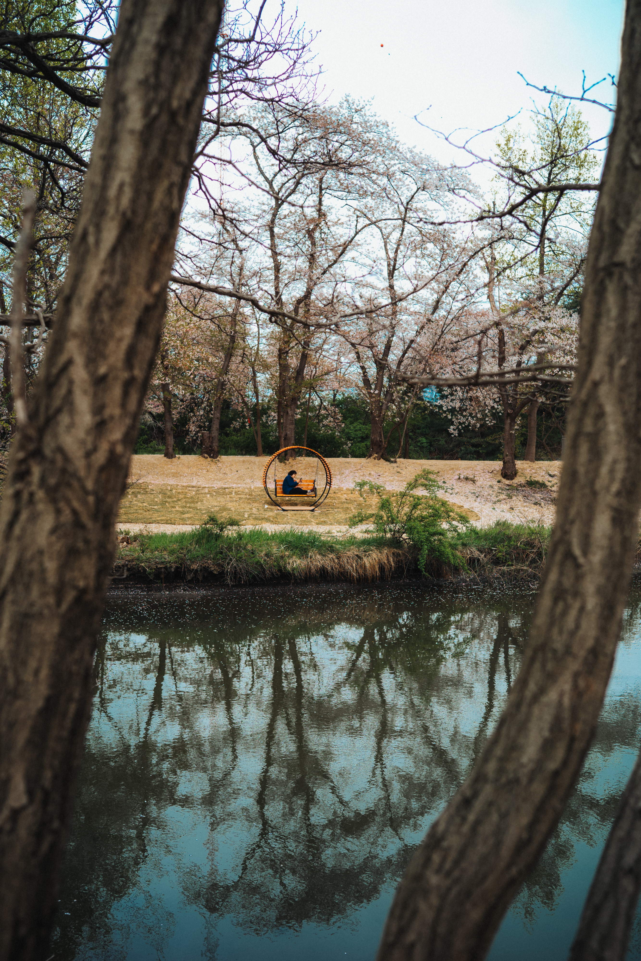 원래는 한 주 전에 가려고 했습니다만 비 예보로 일정을 연기했어요. 비를 피한 것은 다행이었지만 아쉽게도 경포호의 벚꽃이 다 떨어져 버렸죠. 그래도 호숫가 한켠 공원에 아직 꽃송이가 남아 있었습니다. 잔잔한 물은 꽃잎을 품고 있었고요. 아마도 올 봄 벚꽃 축제의 마지막 날이 아니었을지. 그 여유를 누리는 모습이 아름다워 사진에 담았습니다.