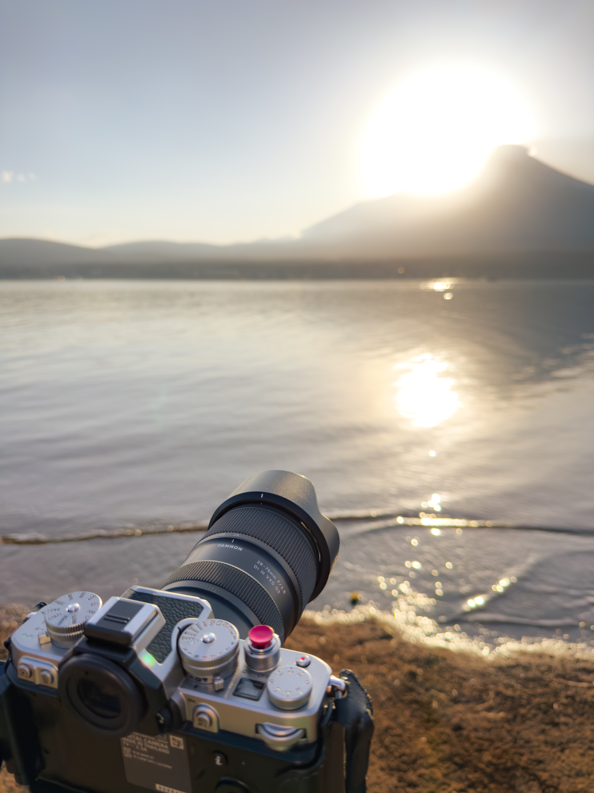 위 사진은 해가 뜨기 전 찍은 것입니다. 일출 배경으로 후지산을 촬영하기 위해 호수 반대편으로 걸어가다 찍은 것인데 눈으로 본 것보다 밝게 찍을 수 있었어요. 가로등 하나 없는 깜깜한 장면이었지만 F2.8 개방 촬영으로 어스름한 새벽 분위기와 붉어지기 시작한 하늘을 담을 수 있었습니다. 요즘 카메라에서 ISO1600은 저감도로 불리니까요.